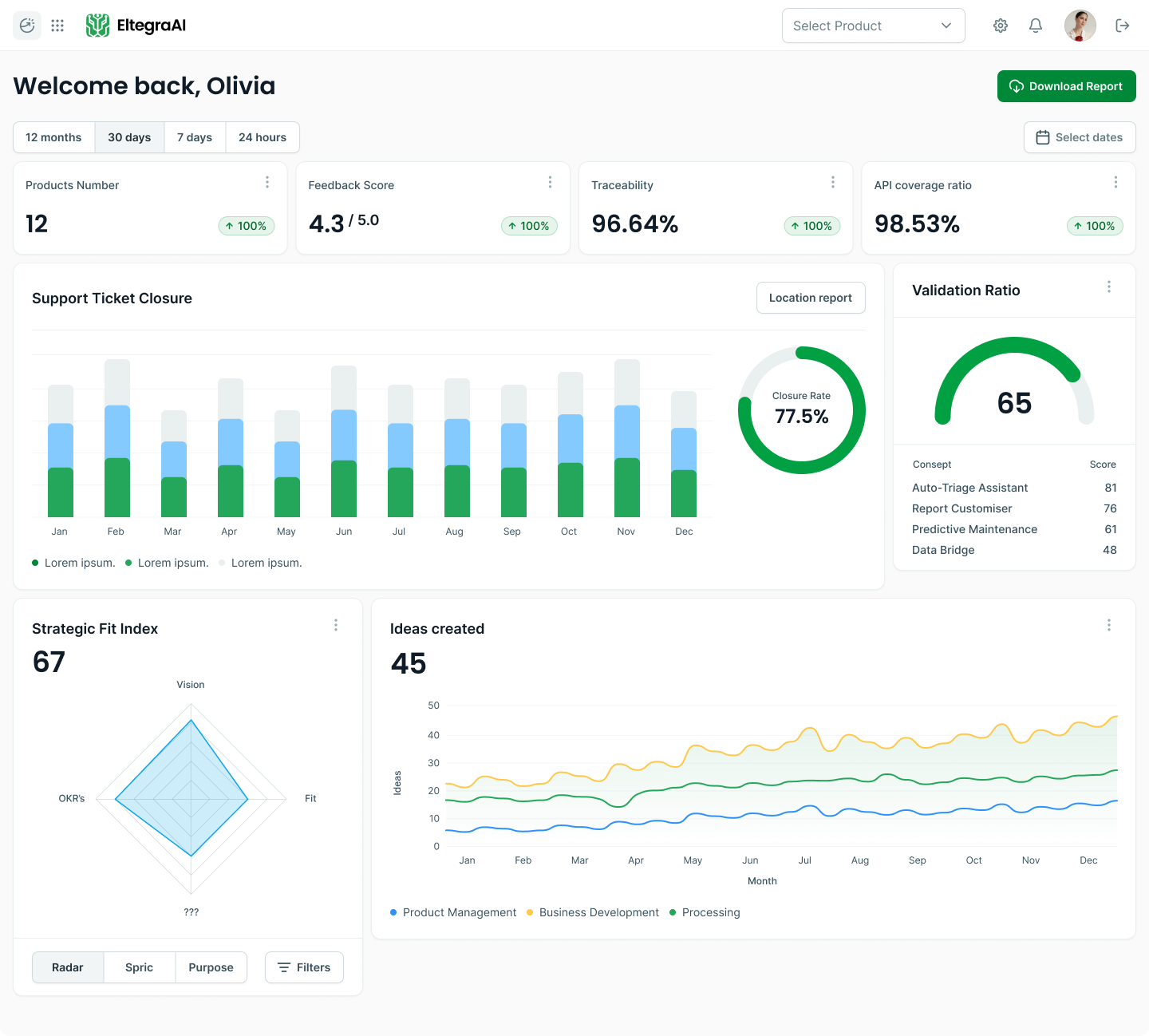 EltegraAI's dashboard isn't one-size-fits-all. Each role sees exactly what they need to make informed decisions across the entire Product Development Lifecycle. From strategic planning to deployment monitoring, your team operates from a single source of truth with permissions that enforce governance, streamline workflows, and reduce risk.