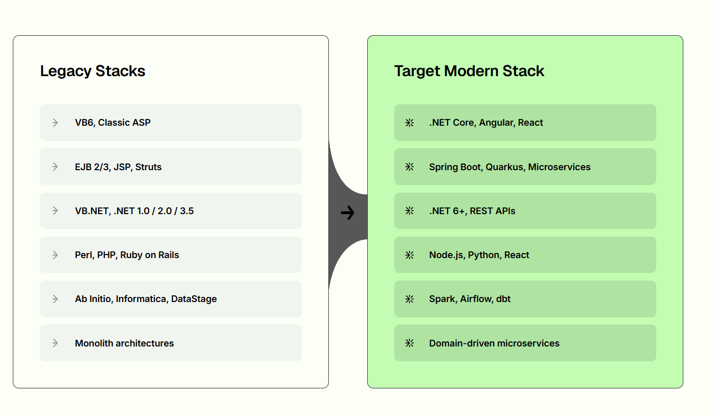 We support modernization across all major enterprise stacks – application, data, and infrastructure + more on request.